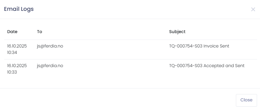 The Email Log gives you a complete record of all communication sent to the customer for a specific order. This includes quotations, confirmations, updates, and any automated messages sent from TEQ.