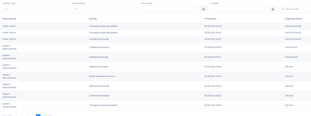 The Employee Activity Log provides full traceability of all actions performed in HR β Employee. Every modificatios, such as creating, editing, deleting, archiving, or resetting an employee, is automatically recorded. This ensures transparency, compliance, and secure handling of employee data.