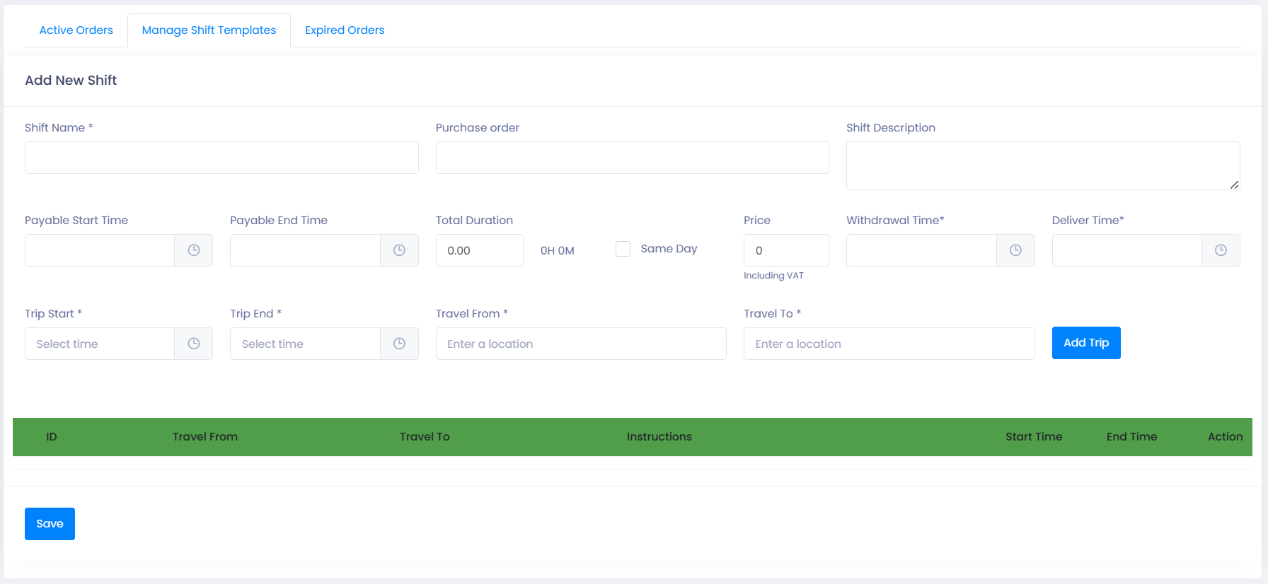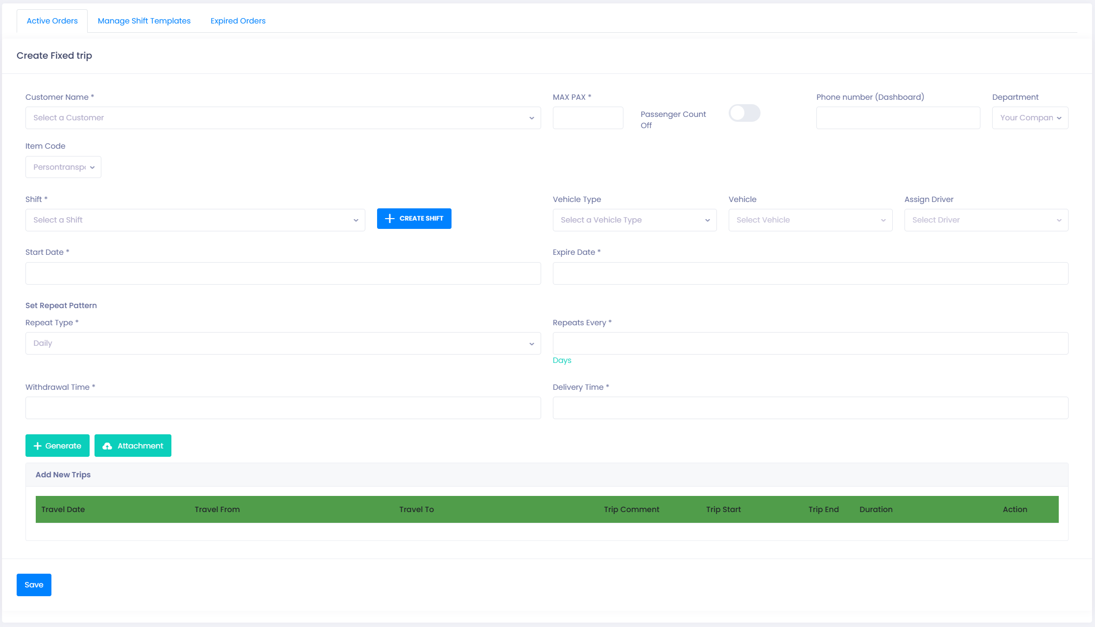 A Fixed Trip Order applies a Shift Template to a customer and generates all relevant trips automatically for the chosen schedule.