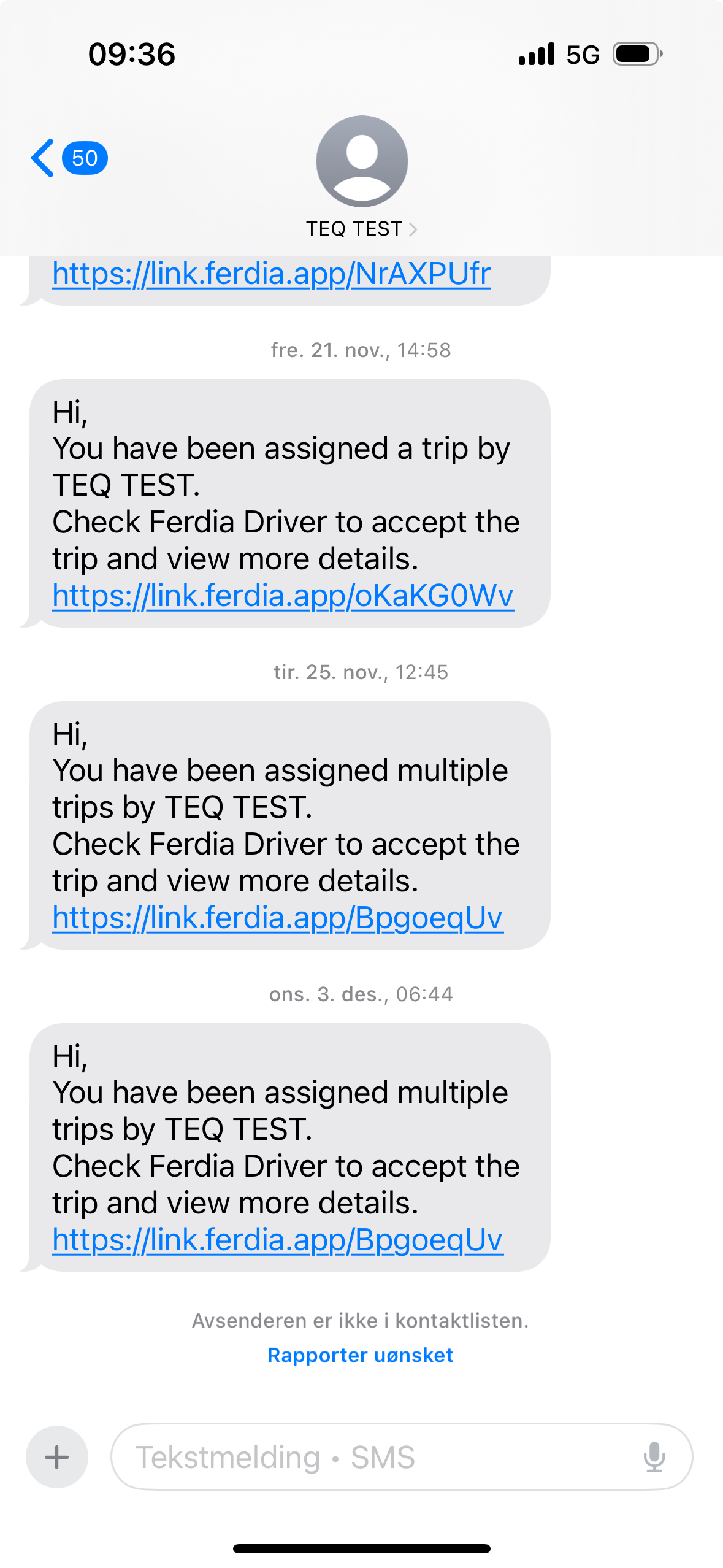 Drivers also receive automated SMS messages whenever their assigned trips or mission details change. These notifications keep drivers aware of updates even if they are not actively in the Ferdia Driver App.