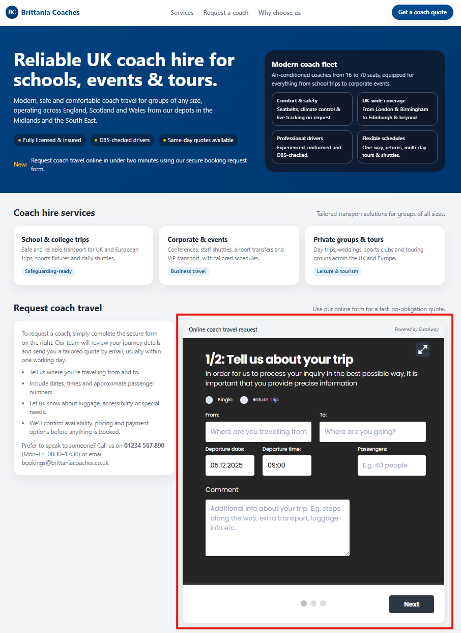 The Public Query Form allows you to publish a fully integrated trip request form on your website. Any request submitted through the form appears instantly inside TEQ under Sales → Requests, ensuring a fast and seamless workflow.