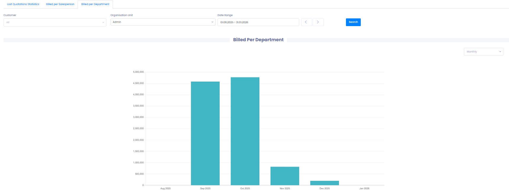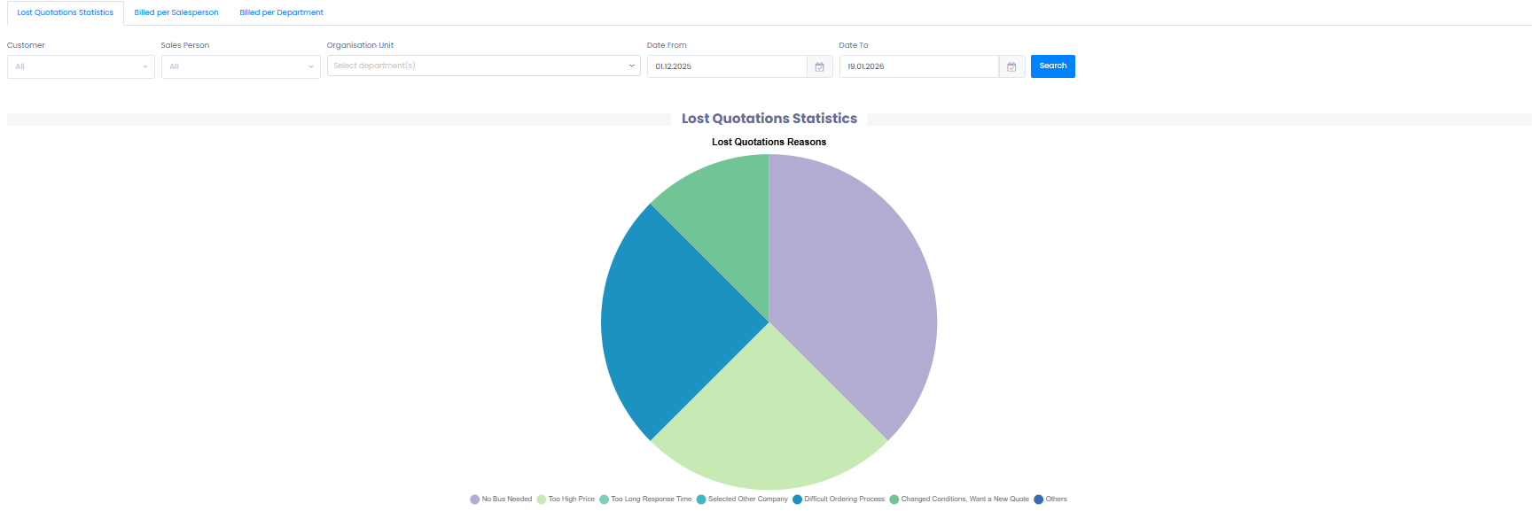 Understanding why offers are lost and reviewing your sales performance over time is essential for improving conversion rates and strengthening revenue forecasting. TEQ provides a dedicated Sales Information module where you can analyze lost quotations, billed amounts per salesperson, and billed amounts per department.