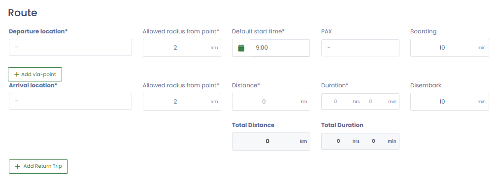 β Maximum distance the customer can adjust departure or arrival - π Default start time (can be changed later)