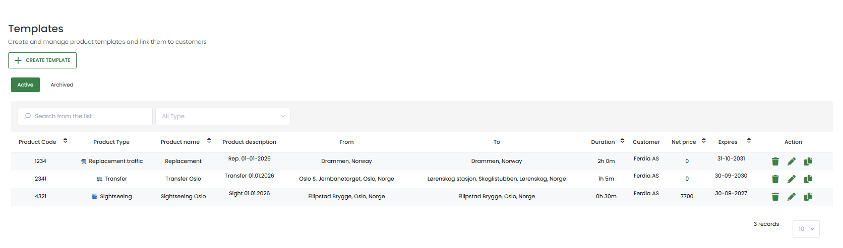 Trip Templates allow you to predefine frequently used trips with fixed routes, durations, distances, and pricing.