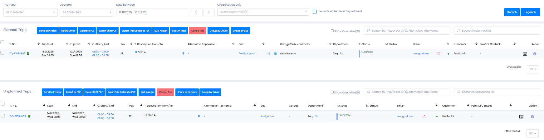 The Trips List provides a classic table-style overview of all your planned and unplanned trips. Each trip appears on its own row, giving planners immediate access to key trip data and powerful quick-action tools, ideal for fast, detailed operational planning.