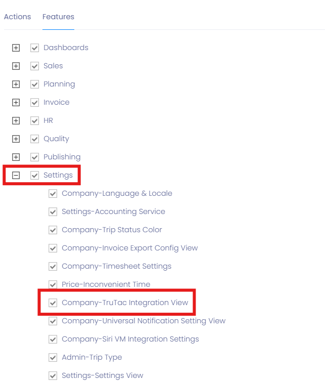 - Under Features β Settings, enable TruTac integration